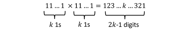 The generalization to any number of 1s in the number we are squaring is obvious. This means we can also extend the palindromic pattern beyond base 10, for example to hexadecimal and multiply the hexadecimal number 11111111111111116 by itself to get,