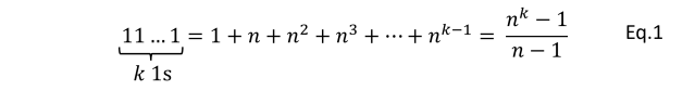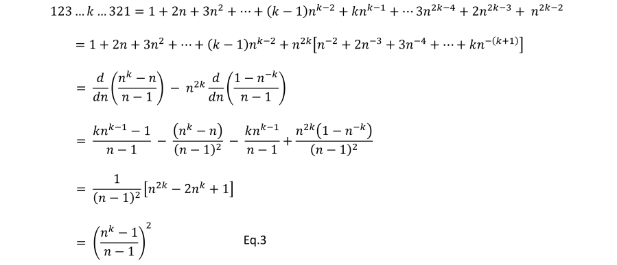 Ok, so there does appear to be a pattern emerging. Can we prove the general case? Let’s do the equivalent to what we have done above, i.e. convert the calculations from a place-value representation to a numeral. The base n number consisting of k 1s is,