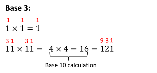 The red numbers denote the place-value corresponding to each digit position. The base 3 case gives two examples (see below),