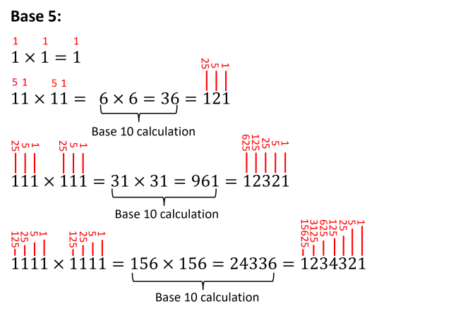 Now it becomes clearer why we get the result 11111 x 11111 = 123454321 for any base n > 5. It is due to the shifting and aligning of multiple copies of the original starting number 11111.