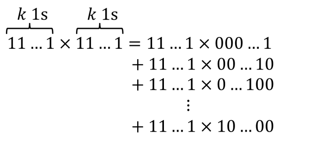 Remember we can break down any multiplication a x b as the sum of separate multiplications, each of which involves just one of the digits of b multiplying a. So we can write 11…1 x 11…1 as,