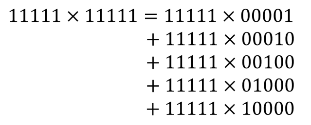 Note we haven’t said what base we’re in. That is because the decomposition above holds for any base. Now remember that when we multiply by a number of the form 00010, we shift the digits of whatever number we’re multiplying one place to the left. So, 11111 x 00010 = 111110. Likewise, when we multiply with 00100, we shift all digits two places to the left. If we multiply with 01000, we shift three digits to the left.
