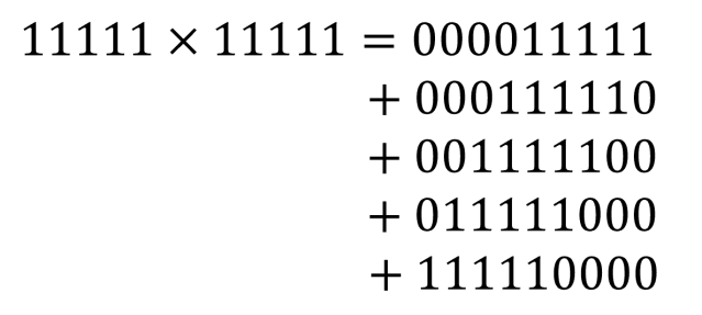Now, with all that shifting of digits to the left we’re going to need a bigger register to align all of our multiplications. We’ll add zeros at the front of each multiplication. For example, 11111 x 00100 = 1111100 now becomes 11111 x 00100 = 001111100. With the extra zeros in place, we can finally write 11111 x 11111 as,