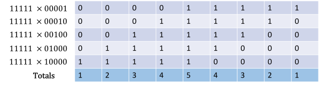 You can now see how all the 1s on the right-hand side line up in columns, allowing us to count how many we’ve got. Now we must impose the restriction that we are in base n > 5 so that when we add up all the 1s in a column we don’t get any carry over. If we put the above result in a table format, the column totals become clearer – see below.