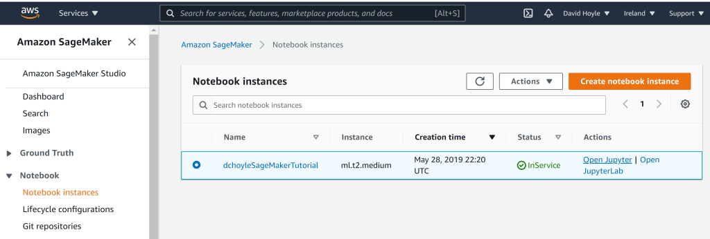 Now we have the container, that has our GP code, in AWS ECR we can use it within a SageMaker notebook. Let’s do so. For this I’m just going to adapt the notebook within the original AWS repo. I go to the Sagemaker under ‘ML’ in the list of AWS services and from there I can start/create my SageMaker notebook instance. Once the notebook instance is ready I can open up a Jupyter notebook as usual,