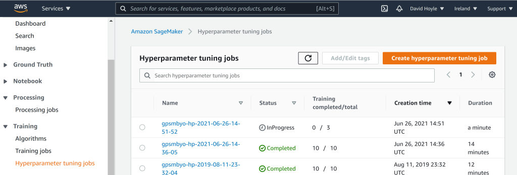 If we then look at our AWS console (screenshot below) we can see the hyperparameter tuning job running, along with previous completed tuning jobs.