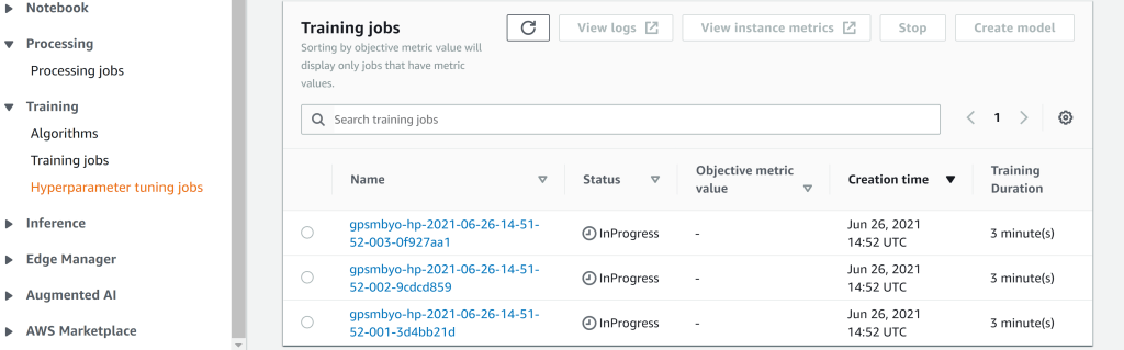 We can also see the individual training jobs, corresponding to that tuning job, running (screenshot below). Remember that the hyperparameter tuning job is just a series of individual evaluations of the validation metrics, run at combinations of (q,l) specified the tuning algorithm. From the screenshot we can see that there are 3 training jobs running, in accordance with what we specified in the tuning job config.