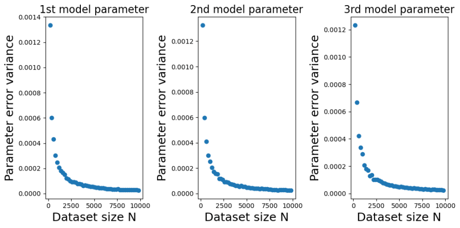 Contrast this behaviour with how the variances of the parameter estimate errors change with N in the plots below.